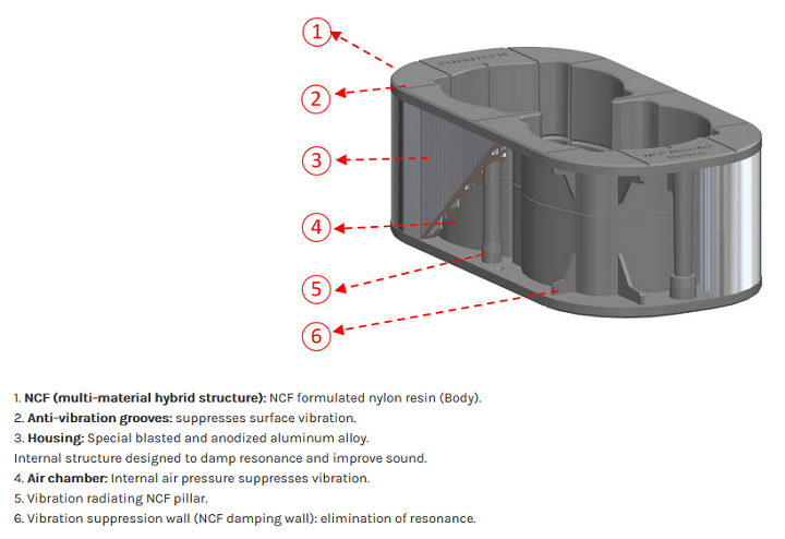 The NCF material is the same noise and vibration reducing material Furutech uses in their FI-50 NCF plugs. NCF features a special crystalline material that has two ‚active‘ properties. First, it generates negative ions that eliminate static charge. Second, it converts thermal energy into far infrared. Furutech combines this remarkable material with nano-sized ceramic particles and carbon powder for their additional ‚piezoelectric effect‘ damping properties. The resulting Nano Crystal Formula is the ultimate electrical and mechanical damping material.
