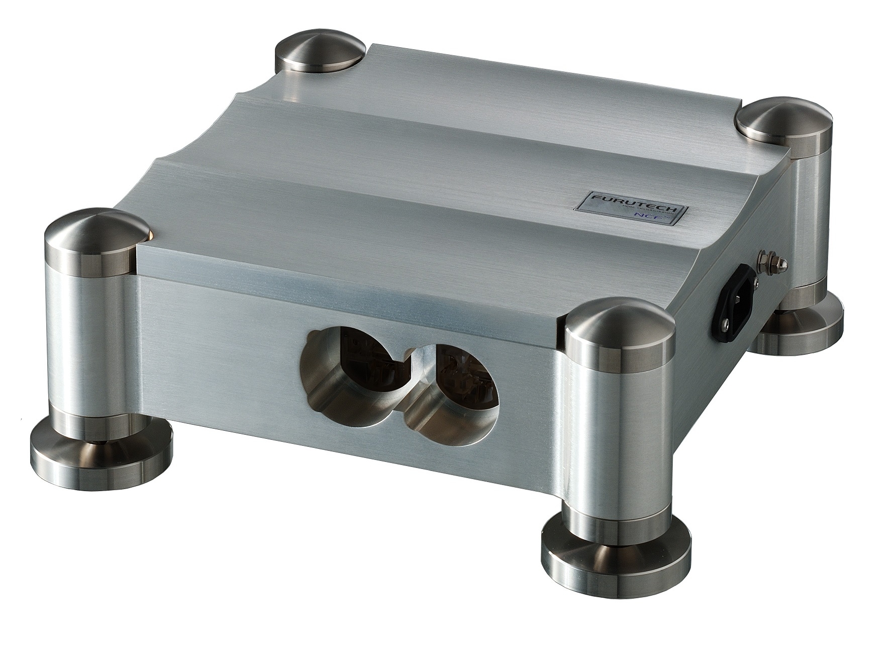 The substantial, beautifully-crafted chassis is precision CNC-machined from a solid aerospace-grade aluminium alloy that effectively shields against RFI (Radio Frequency Interference). Three separate milled compartments house three independently-wired duplex receptacles using top-quality Fluorpolymer-shielded high-purity silver-plated Alpha-OFC. The hot and neutral conductors from the IEC loom into a large, centrally-located chamber–secured Bugatti-like with eight beautifully machined rivets–that’s filled with Furutech’s EMI-absorbent Formula GC-303 material. GC-303 absorbs the high-frequency noise that develops whenever passing current through wire. Furutech’s patented GTX-D NCF Receptacles enhance the vault-like build, ensuring the tightest and most secure power cord fit imaginable.
