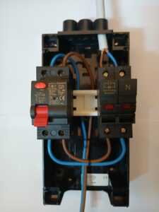Ein Fehlerstromschutzschalter (FI-Schalter), auch Fehlerstrom-Schutzschalter (FI-Schalter) oder Erdschlussschutzschalter (GFCI) genannt, ist in allen Hausinstallationen vorgeschrieben. Im Gegensatz zu einer Sicherung (z. B. einer zylindrischen Sicherungspatrone), die bei Überlastung oder Kurzschluss einen Brand verhindern soll, dient ein Fehlerstromschutzschalter hauptsächlich dem Schutz vor Stromschlägen. Er vergleicht die ein- und ausgehenden Ströme durch Phasenleiter und Neutralleiter; deren Summe muss null ergeben. Die einzige mögliche Störung dieses Gleichgewichts entsteht, wenn ein gewisser Strom gegen Erde fließt. Fließt dieser Strom durch den menschlichen Körper, kann dies lebensbedrohlich sein. In diesem Fall greift der Fehlerstromschutzschalter ein, sobald dieser Strom 30 mA überschreitet, und trennt den Stromkreis blitzschnell vom Netz.
