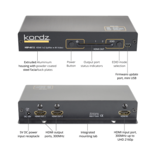 The Kordz HSP-4K12 is a compact 300MHz HDMI distribution amplifier for splitting one uncompressed AV signal up to UHD 2160p/30 simultaneously to two sink devices. Features four user selectable EDID profiles to mitigate sink conflict with min/max audio or video bias. The integrated mounting tab permits vertical surface mounting.