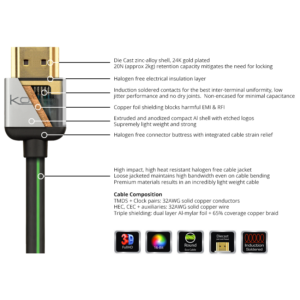 In direct comparison with other HDMI cables, the EVO is far superior. The EVO uses solid metal connectors (most HDMI cables use folded metal connectors). Due to these solid connectors, your cable locks rock solid into your equipment. No additional locking accesories are needed. All Kordz HDMI cables exactly follow the HDMI compliance rules. This seems to be logical but the simple fact locking accessories do exist to prevent your cables from falling out tells you, this is not true. (this is no example of „fine engineering“). Kordz EVO cables require at least 2 kg of pull to detach the connector from your equipment.