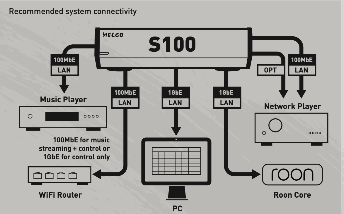 Roon systems have both music storage and the Roon Core connected to the network which can generate a lot of traffic. The Melco S100 has both ports optimised for sound quality, as well as ports optimised for both sound quality and throughput. This creates an ideal Roon infrastructure without any compromise.