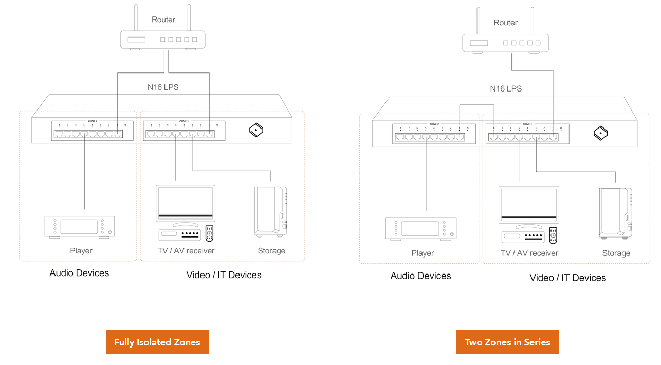 The Silent Angel N16 LPS has two isolated zones for network traffic isolation. Physical isolation avoids ethernet traffic intereference, so the (most critical!) audio player gets rid of unwanted network traffic.