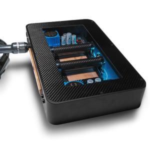 Synergistic Research starts with a new chassis machined from a solid billet of aluminum and carbon fiber to address unwanted vibration and chassis resonance that would otherwise lower your system’s performance. The internal Electromagnetic Cell increasing the number of active filters from one as found in our Active Ground Black SE to three Active Em Cells with Galileo SX PowerCell technology was re-engineered. This includes two rolled EM Cells in carbon fiber housings to control resonance and one flat Carbon Fiber Electromagnetic Cell with a copper mesh ground plane as found in our Galileo SX PowerCell. In addition, the gain was turned up in a new ULF Generator for three times the signal strength of the Active Ground Block SE for a significant gain in performance. And since the Galileo Ground Block was developed in conjunction with the limited edition 2nd Generation Galileo SX PowerCell it shares its ability to custom tune the sound of the ground filter to compliment your system and personal tastes by changing the bias frequency of the ULF signal generator. By pressing a button on the back of the Galileo Ground Block you change the frequency that biases its three Active EM Cells and this changes the characteristic sound of your system. There is a default setting shared with the current Active Ground Blocks and three new frequencies that make your system sound more liquid or dynamic and holographic; the choice is yours. And to make keeping track of which frequency you have selected easy, when you press the button, it changes the color of the light inside the unit, visible from the view window on the top of the unit. New useful features were added like the ability to directly wire both your PowerCell line conditioner and Atmosphere Acoustic Field Generator to increase their performance.