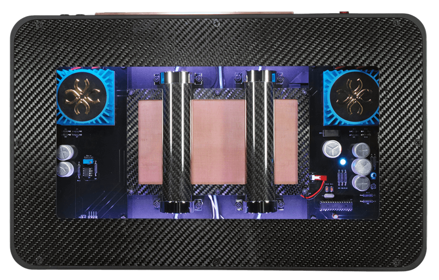 Now biased with Galileo SX ULF Generator. The two-carbon fiber tubes you see in the Galileo SX Ground Block are folded Active Electromagnetic Cells. The folded cells have been used on SR Power conditioners for years, but Galileo SX Ground Block is the first SR Ground device to incorporate these cells which are 25 % denser than prior folded EM Cells; this means greater filtration for a lower noise floor and enhanced dynamics. The folded EM Cells plus the flat EM Cell are also biased, below the center copper mesh, with the new multi-setting Galileo SX ULF generator. Prior SR active ground devices only bias the single flat EM Cell. 25 % more filtration combined with biasing the EM Cells improves your system’s ability to soundstage over the already excellent soundstaging of other SR ground devices.
